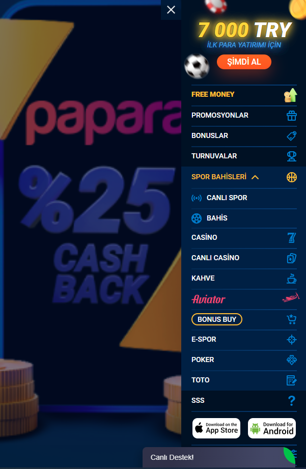| Casino Oyunları | Slotlar, poker, blackjack, rulet, bakara, piyangolar, totalisator, video poker, jackpot makineleri, canlı krupiyeli canlı oyunlar, Aviator, hızlı oyunlar |
